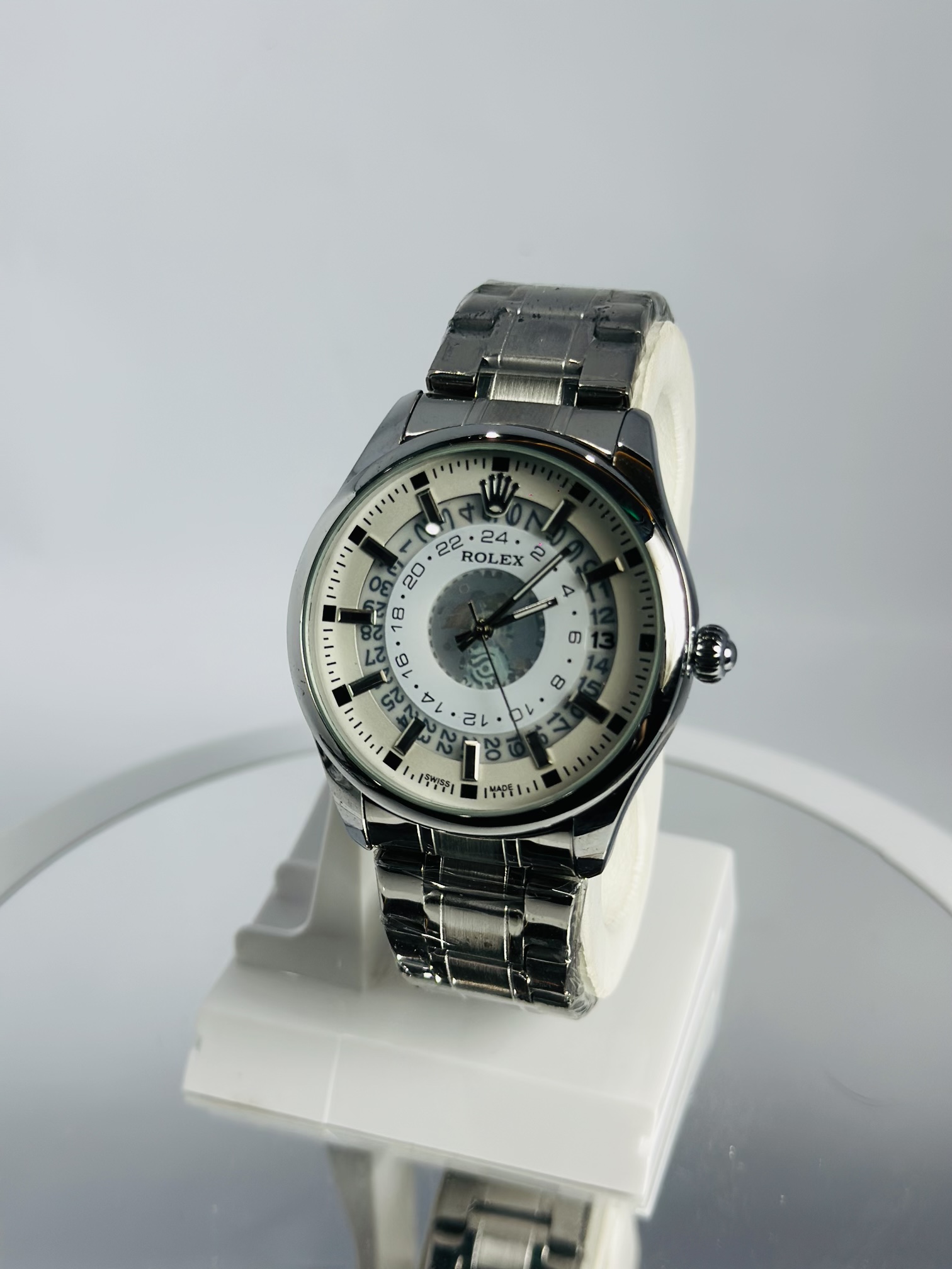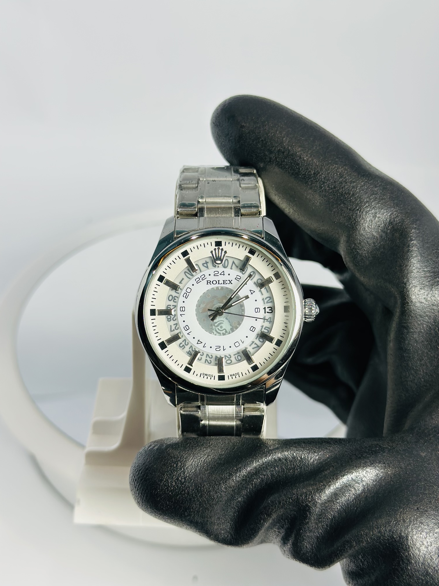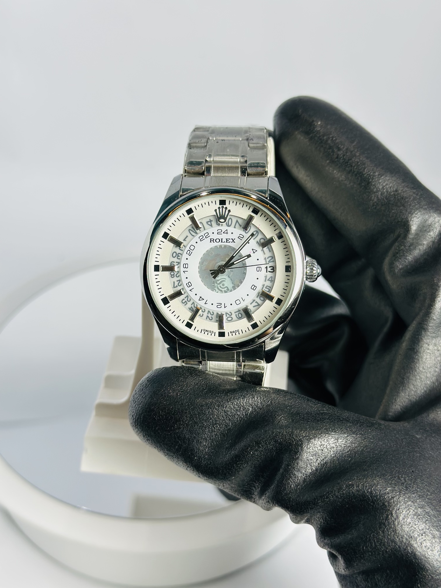 Rolex Silver Stone–Style Watch (White Dial with Date)